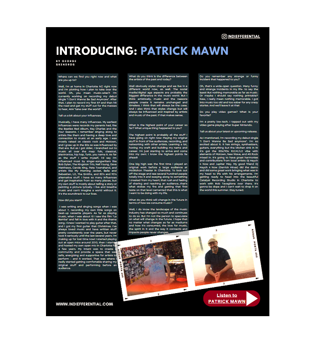 Patrick's musical journey is just now  taking full flight. He's already made an impression and worked with top talent both established and up and coming, as well as great producers like Shannon McArthur (Dashboard Confessional), and Emmy-winner Rob Tavaglione (Catalyst Studios). Patrick's work has garnered attention and strong praise from fans, critics and fellow artists . He's on the roster of  top booking agencies like  East Coast Entertainment, has toured the US and has performed regularly locally in Charlotte at events and venues across Charlotte such as the Music At The Met Series, the Milestone Club, Evening Muse and Spirit Square.